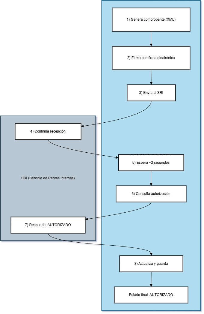 En la práctica, esto se traduce en un flujo donde el comprobante se gestiona en línea con el SRI desde el momento de su emisión, y se mantiene el seguimiento del estado hasta obtener la respuesta final.