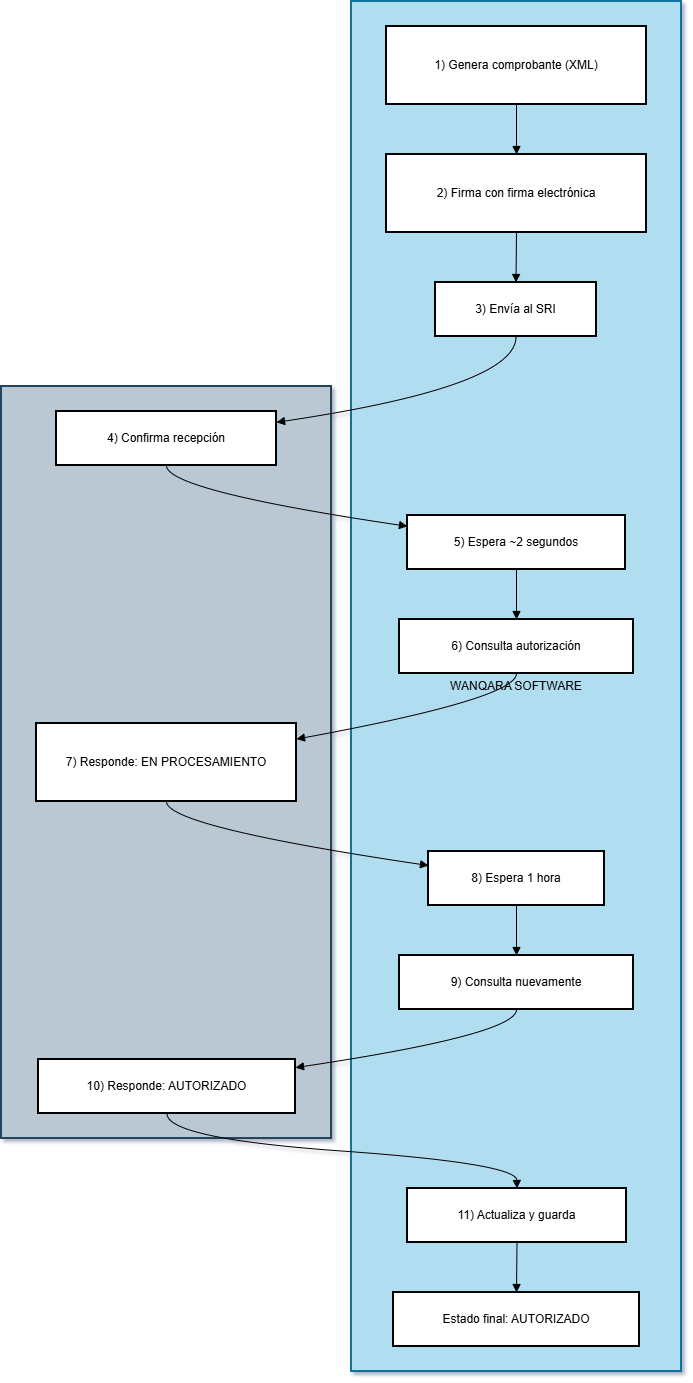 El SRI confirma recepción, pero indica EN PROCESAMIENTO. Wanqara mantiene seguimiento y vuelve a consultar hasta obtener AUTORIZADO.