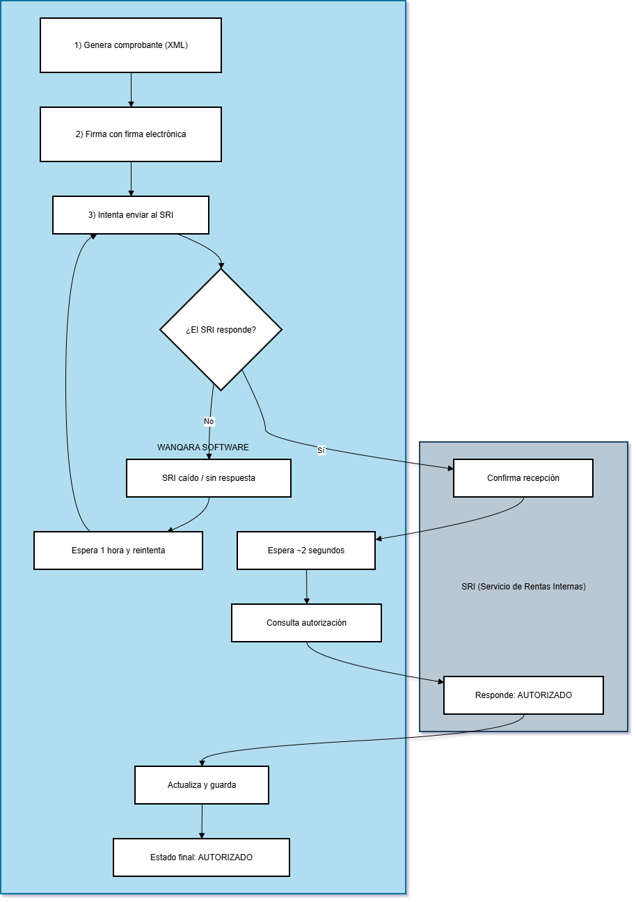 Si el SRI no responde, Wanqara mantiene el comprobante seguro y realiza reintentos automáticos hasta que el SRI se restablezca y el flujo termine.